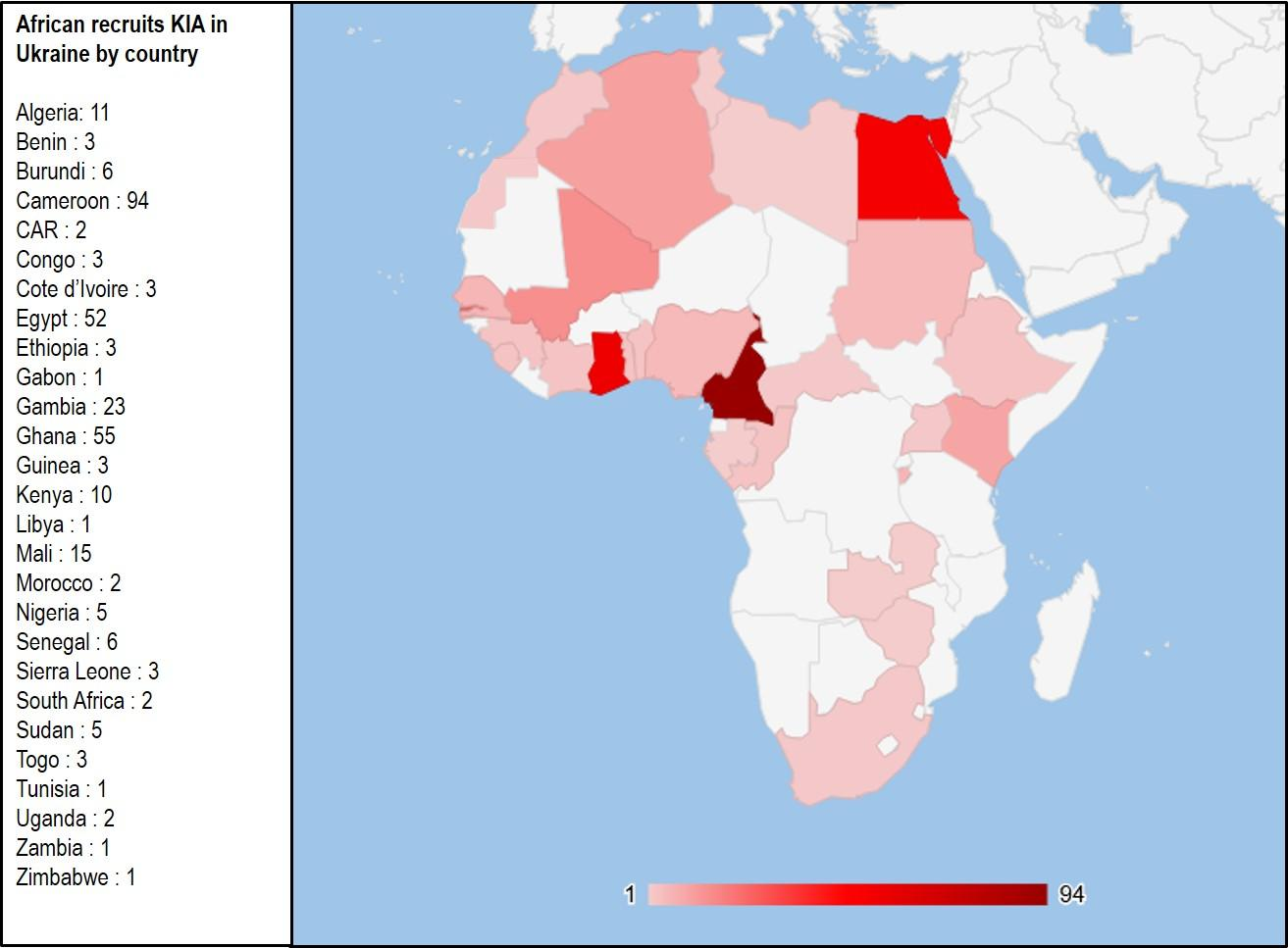 Derrière les promesses de « contrat » et de « chance », le dossier met en avant un chiffre qui écrase le reste : 316 morts africains recensés parmi les recrues identifiées. Le rapport précise que les Camerounais paient le tribut le plus lourd (94 morts), devant les Ghanéens (55) et les Égyptiens (52).